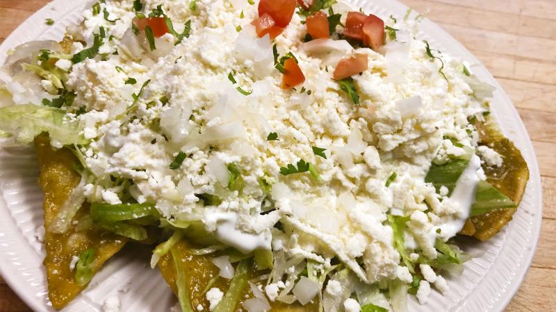 Chilaquiles $10.95 Fried corn tortilla chips topped with 2 fried eggs, green or red salsa, shredded lettuce, queso fresco, sour cream, cilantro and onions