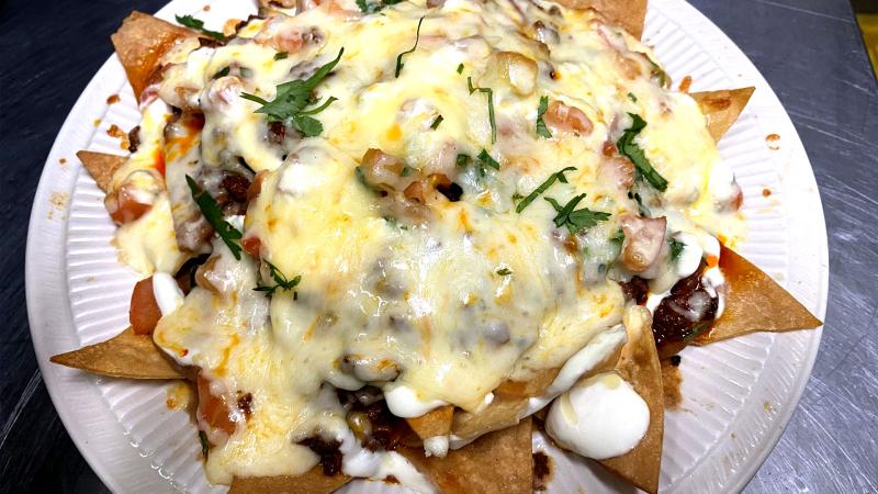 Nachos $9.25 Tortilla chips topped with refried beans, pico de gallo, sour cream and melted cheese